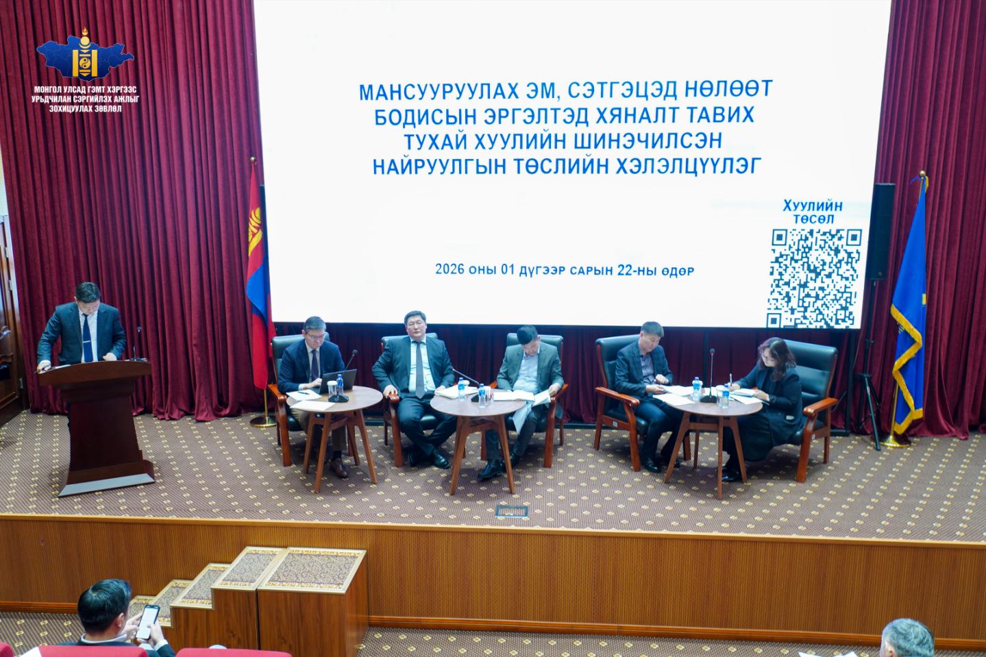 Мансууруулах эм, сэтгэцэд нөлөөт бодисын эргэлтэд хяналт тавих тухай хуулийн шинэчилсэн найруулгын төслийг олон нийтэд танилцуулах хэлэлцүүлэг өнөөдөр (2026.01.22) боллоо.